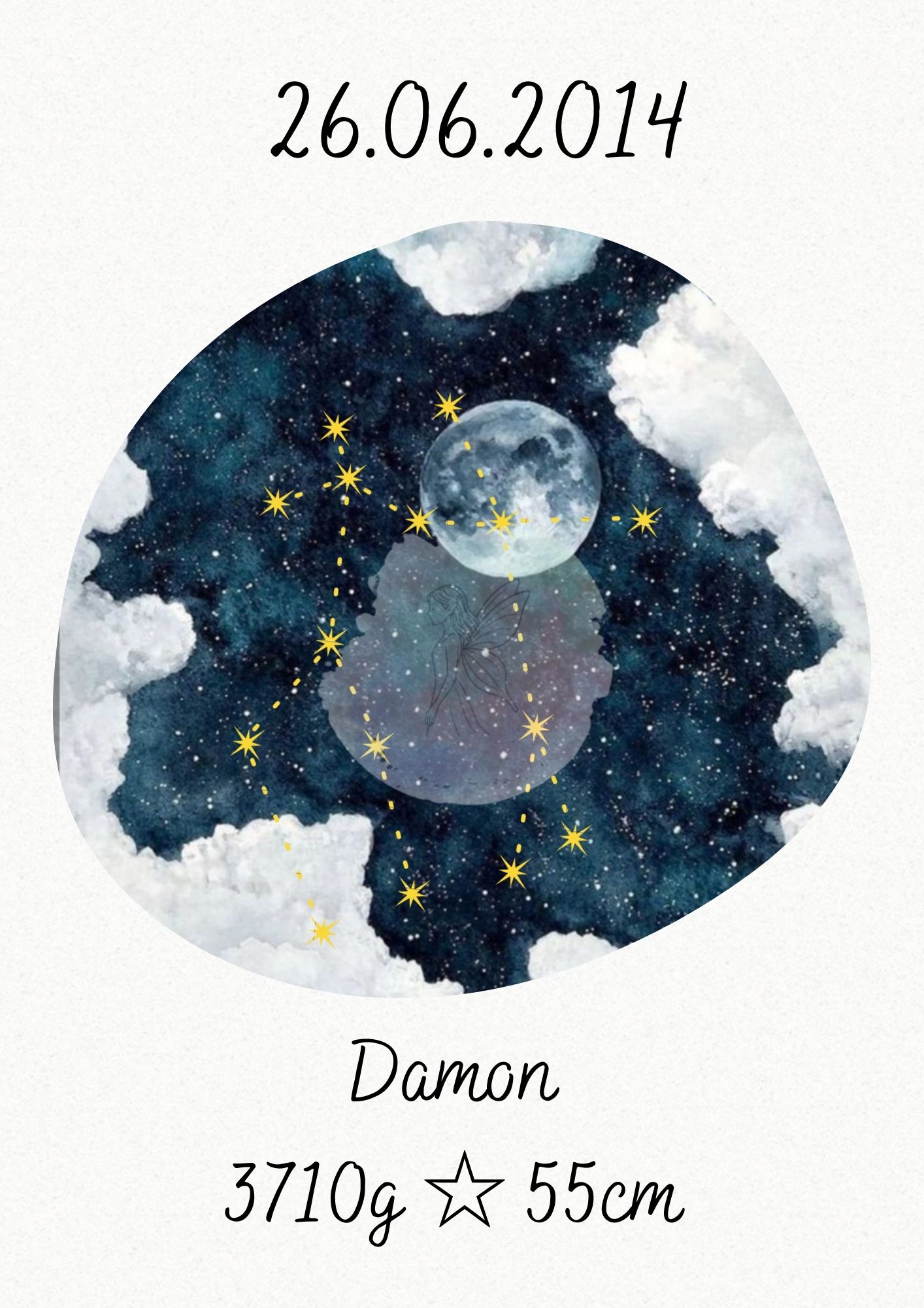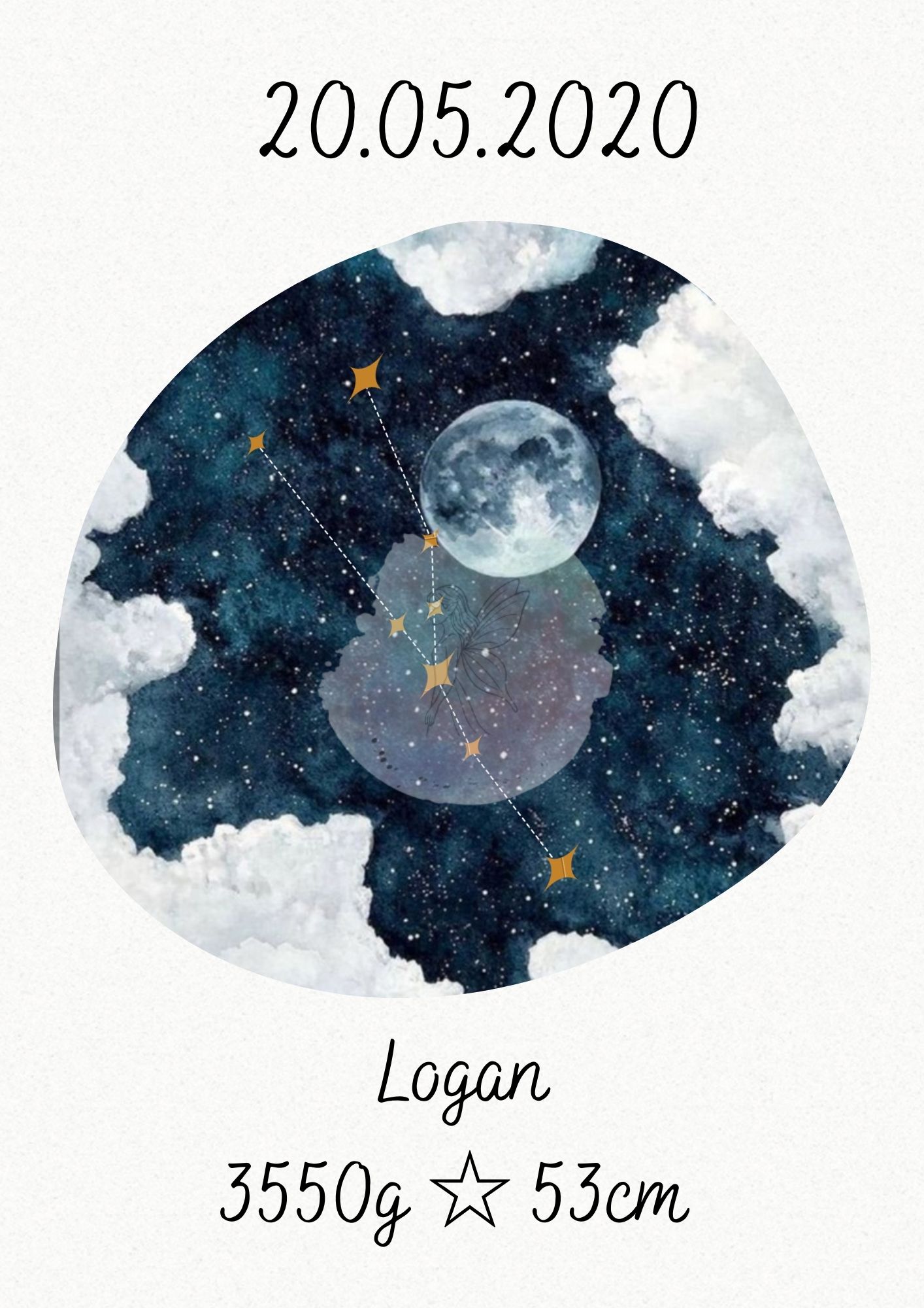 Mit Sternenbild erhältst du ein liebevoll gestaltetes Bild des Sternenbilds deines Kindes. Das Motiv wird ergänzt durch die wichtigsten persönlichen Daten: Name, Geburtsdatum, Gewicht und Größe. So entsteht ein einzigartiges Erinnerungsstück, das die Ankunft deines Kindes auf besondere Weise feiert.
