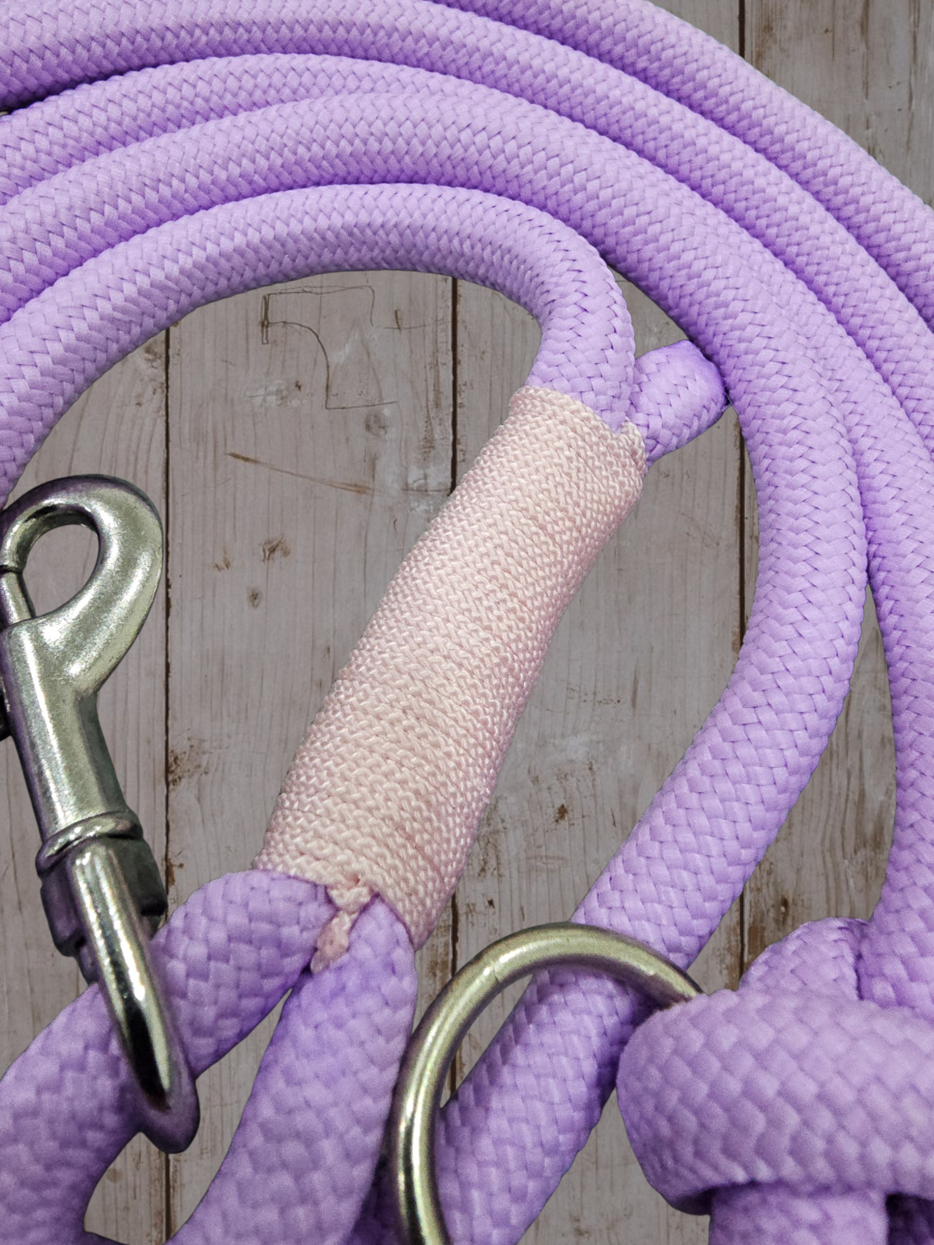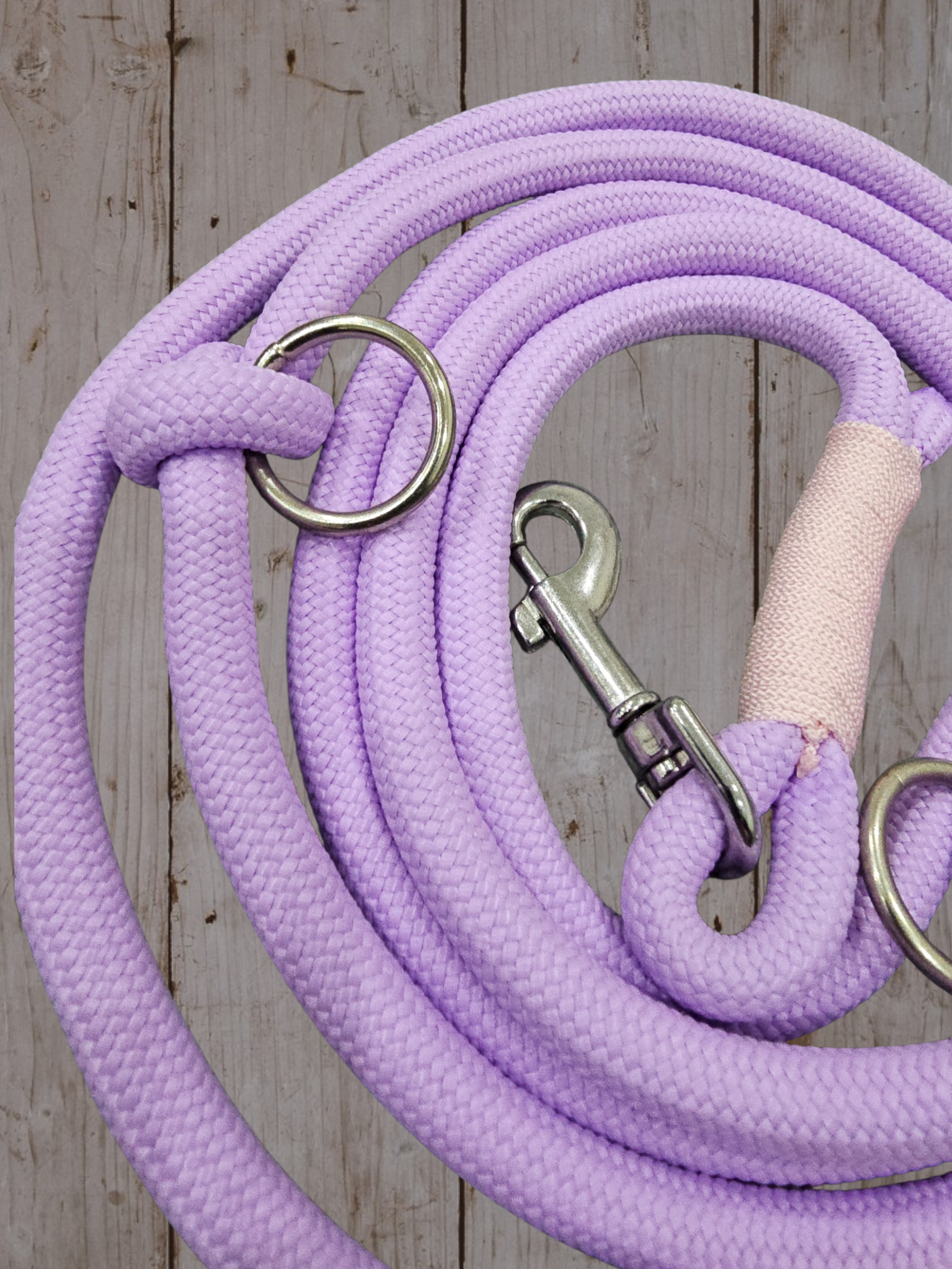 Unsere Tauleine „Selara“ besteht aus robustem 6 mm Tau, ca. 2,70 m lang in zartem Pastel Lila, ausgestattet mit 2 Karabinern und 2 Ringen zum Anpassen. So kannst du die Leine flexibel als normale Leine, Doppelleine oder individuell gekürzt nutzen.