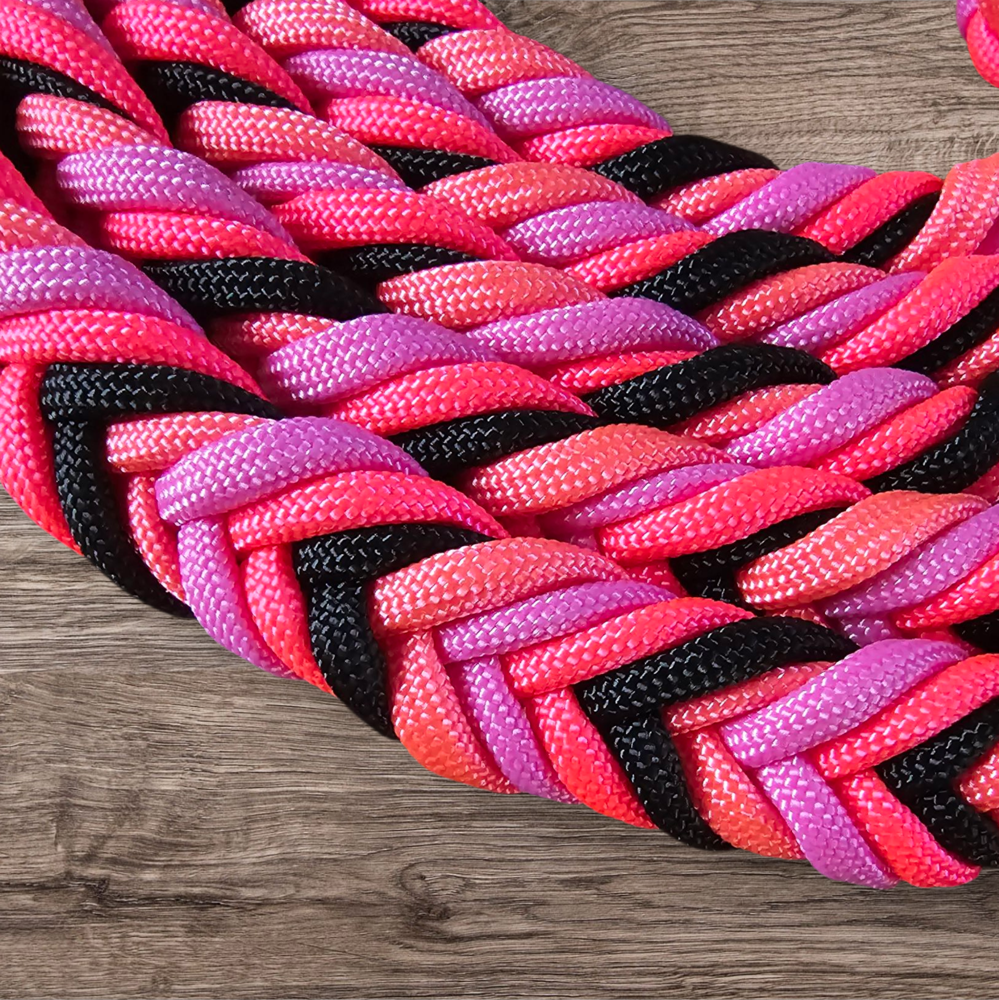 Die Leine ist aus hochwertigem 550-Cord, ca. 2,30 m lang, mit 2 Karabinern und 2 Ringen, die eine individuelle Anpassung der Länge ermöglichen. Besonders auffällig ist die Herzform-Optik durch das Knotendesign, kombiniert mit einer Sonderfarbe „Spotted“.