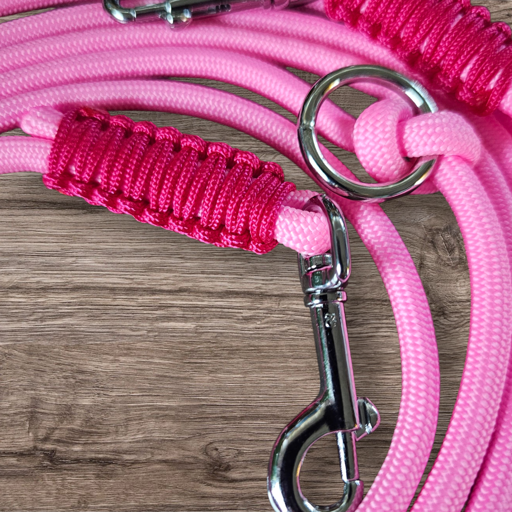 Unsere Tauleine „Vivia“ besteht aus robustem 6 mm Tau, ca. 2,80 m lang in leuchtendem Neon-Pink, ausgestattet mit 2 Karabinern und 2 Ringen zum Anpassen. So kannst du die Leine variabel nutzen ob als normale Leine, Doppelleine oder individuell gekürzt.